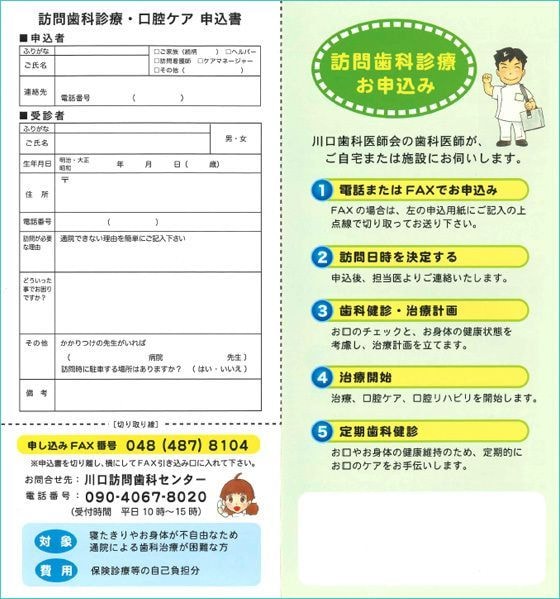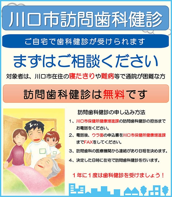 川口訪問歯科センター 通院が困難でお困りの方は、お問い合わせください。 電話 090-4067-8020 (10時~15時) 診療は有料ですが、無料の健診も受けられます。 川口市訪問歯科健診 ご相談は下記へお願いします。 川口市保健所健康増進課 電話 048-256-1135 受付時間 月~金 8:30~17:00 障害福祉課 電話 048-259-7926 訪問歯科診療・訪問歯科健診 通院が困難でお困りの方は、お問い合わせください。 成人歯科健診+歯科ドック・口腔がん検診 各種健診・検診のご案内です。 1歳6ヵ月・3歳児・妊婦歯科健診 川口歯科医師会では各種検診事業を行っています。 障害者の方の歯の相談・治療 歯科相談や治療ができる施設へのご紹介、障害者歯科相談医制度のご案内 スポーツマウスガード スポーツによる怪我を防止。 ※要件に変更があります パートナー歯科衛生士 ただいま募集中です。 こども110番の歯科医院 万が一の時に歯科医院で子どもを保護するしくみです。 広報誌スマイル 川口歯科医師会が発行する広報誌「スマイル」です。 防災への取り組み 大きな災害が発生したときに歯科医療救護活動を行います。