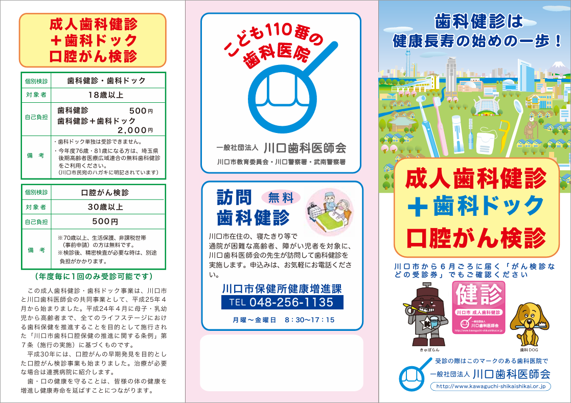 成人歯科健診+歯科ドック 詳しくは川口市ホームページをご覧ください。成人歯科健康診査・歯科ドックのご案内 口腔がん検診 詳しくは川口市ホームページをご覧ください。口腔がん検診 ご案内パンフレット 以下PDFファイルよりご確認ください。ご案内パンフレットPDF 訪問歯科診療・訪問歯科健診 通院が困難でお困りの方は、お問い合わせください。 成人歯科健診+歯科ドック・口腔がん検診 各種健診・検診のご案内です。 1歳6ヵ月・3歳児・妊婦歯科健診 川口歯科医師会では各種検診事業を行っています。 障害者の方の歯の相談・治療 歯科相談や治療ができる施設へのご紹介、障害者歯科相談医制度のご案内 スポーツマウスガード スポーツによる怪我を防止。 ※要件に変更があります パートナー歯科衛生士 ただいま募集中です。 こども110番の歯科医院 万が一の時に歯科医院で子どもを保護するしくみです。 広報誌スマイル 川口歯科医師会が発行する広報誌「スマイル」です。 防災への取り組み 大きな災害が発生したときに歯科医療救護活動を行います。